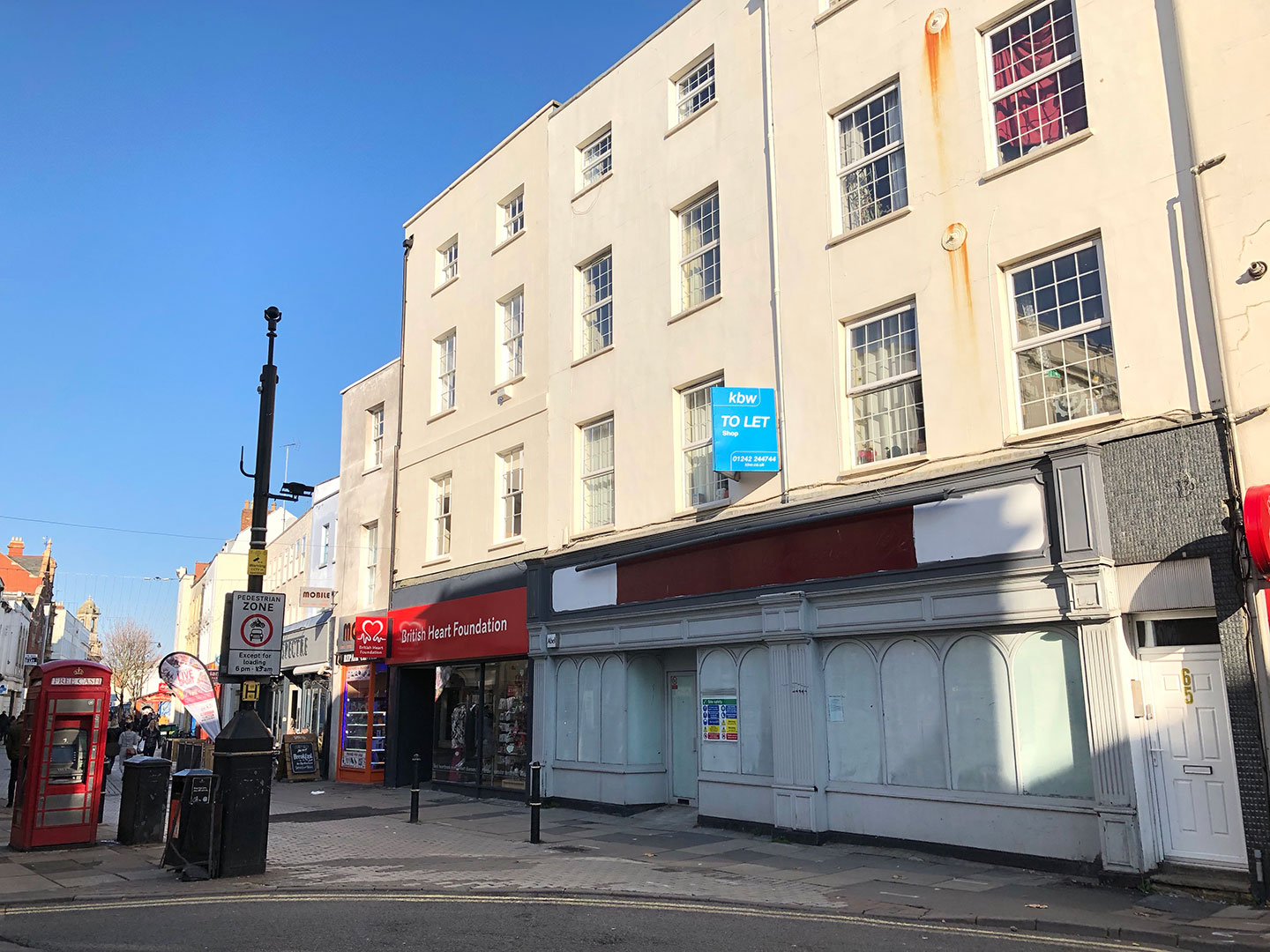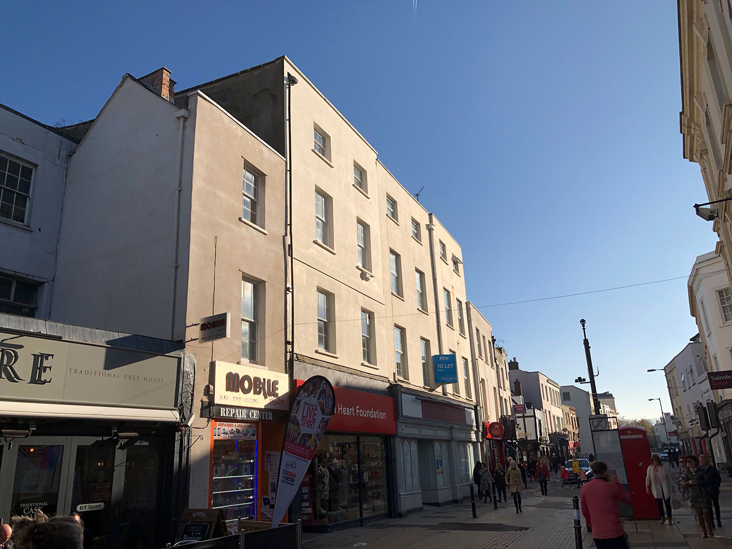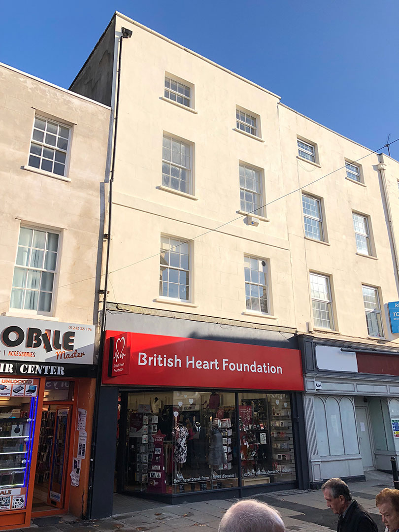 69 High Street is a four storey building located in the centre of Cheltenham, facing the busy High Street retail area. It has been renovated and modernised, by converting the two upper storeys into three town centre apartments, and the lower two storeys have been renewed in their use as a ground floor retail space, and first floor offices under lease to the British Heart Foundation, under a ten year lease.